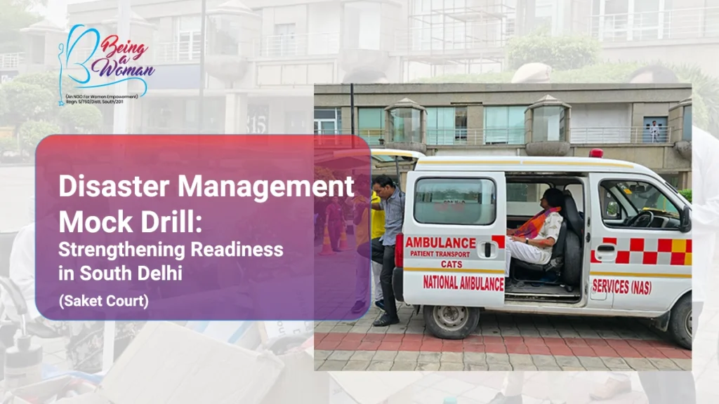 In accordance with the directive from the District Magistrate (DM) South Delhi and under the guidelines of the National Disaster Management Authority (NDMA), a Mega Disaster Management Mock Drill was coordinated on 1 August 2025 across the SOUTH zone to test and strengthen multi-agency emergency response. Being A Woman was proud to participate in the activities held at the Saket Court site, ensuring real-world disaster readiness and community engagement.